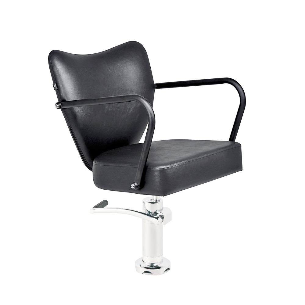 Sillón tocador para peluquería con base fija al suelo, elevación hidráulica y diseño compacto y funcional.