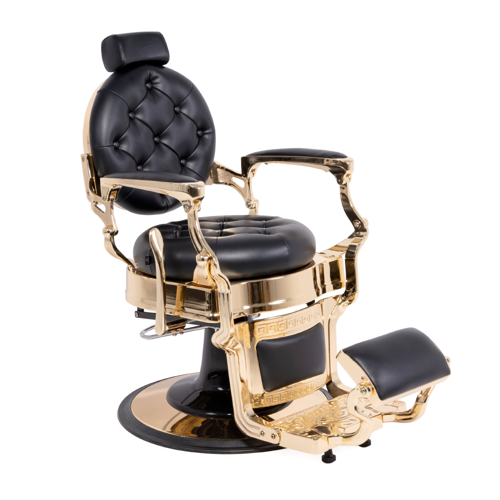 Sillón profesional pensado para barberías con una estética elegante y retro, muy cómodo y versátil, con ajustes de altura y respaldo, reposacabezas y reposapiés.